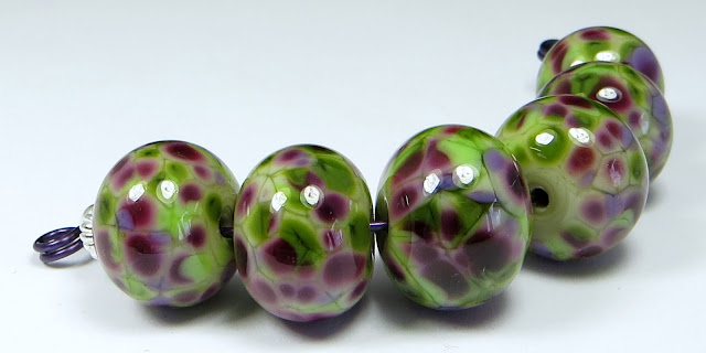 This set of round beads was created on a base of CiM's Dried Sage, an opaque green with a generous sprinkling of Spring Violet glass frit.