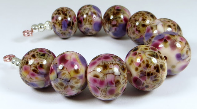This set of beads was created on a base of CiM's Butter Pecan sprinkled with Peruvian Violet and melted into the surface.